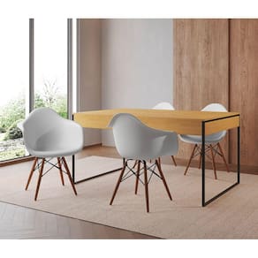 O Conjunto Mesa de jantar Filadélfia e Poltrona Eames é perfeito para reunir a família para saborear um bom prato ao lado das pessoas que mais ama. Garantindo que o seu ambiente fique impecável sem perder o estilo, qualidade e conforto.Tipo: ConjuntoModelo: FiladélfiaBase da Poltrona: MadeiraBase Mesa Ferro: Preto Cor Tampo: Canela Cor Assento: Branco Medidas da MesaAltura: 75cmComprimento: 90cmLargura: 137cmMedidas da PoltronaAltura: 80cmLargura: 38cmComprimento: 38cmAssento até o chão: 40cmBraços até o chão: 65cmATENÇÃOIMAGENS MERAMENTE ILUSTRATIVAS REALIZADO EDIÇÃO, PODENDO HAVER UMA PEQUENA VARIAÇÃO DE COR DEPENDENDO DE CADA TELA OU MONITOR.