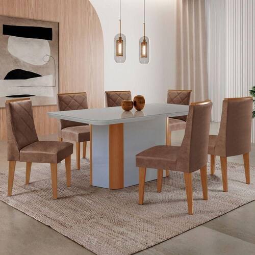 A mesa, com tampo de vidro serigrafado e canto copo, garantem seguranca e durabilidade, enquanto sua base deslumbrante, com detalhe especial na sua angulacao arredondada naturalle, transforma este conjunto em uma verdadeira peca de destaque na sua sala de jantar!