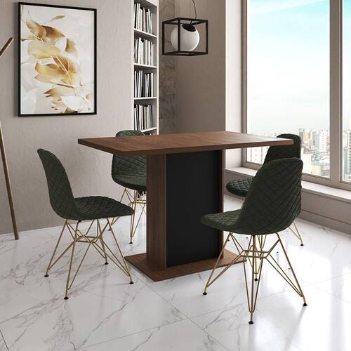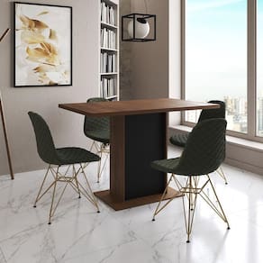 Mesa Jantar Londres Tampo Amêndoa 120cm Base Preta 4 Cadeiras Base Dourado Estofado Verde - Cor: Marrom O Conjunto de Mesa Londres e Cadeira Eames Eiffel Estofada é aquele que é facilmente adaptável a diversos ambientes. O modelo carrega estilo, alinhado ao conforto e qualidade sem perder o charme. Tipo: Conjunto Modelo: Londres e Eames Cor Mesa: Amêndoa e Preto Cor Estofado: Verde Base Ferro: Dourado Medidas Mesa: Altura: 78cm Largura: 120cm Comprimento: 77cm Largura da Base: 68cm Comprimento da Base: 45cm Medidas Cadeira: Altura: 85cm Altura do assento até o chão: 45cm Largura: 47cm Comprimento: 50cm ATENÇÃO IMAGENS MERAMENTE ILUSTRATIVAS, PODENDO HAVER UMA PEQUENA VARIAÇÃO DE COR DEPENDENDO DE CADA TELA OU MONITOR.
