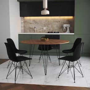 A Mesa de Jantar Redonda Clips com as Cadeiras Eiffel é a escolha perfeita para você que está em busca de um produto sofisticado e muito versátil! O Conjunto possui o diferencial de ser um produto compacto e prático, podendo ser incorporado facilmente nos mais diversos ambientes, como: cozinhas, restaurantes, varandas ou até áreas de festas!CaracterísticasTipo: Conjunto Mesa e 5 CadeirasModelo: ClipsCor do Tampo: AmêndoaCor do Assento: PretoBase Ferro: PretoDIMENSÕES DO PRODUTOCadeira:Altura: 85cmLargura: 47cmComprimento: 50cmMesa:Altura: 85cmDiâmetro: 110cmATENÇÃOAS IMAGENS SÃO MERAMENTE ILUSTRATIVAS E PODEM SOFRER VARIAÇÕES DE COR E PEQUENOS DETALHES DE ACORDO COM O SEU MONITOR, ILUMINAÇÃO DO AMBIENTE E ATÉ MESMO A SUA PERCEPÇÃO VISUAL.Mesa Jantar Redonda 110cm AmÃndoa Clips 3 PÃs com 5 Cadeiras Eames Eiffel Pretas Ferro Preto