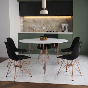 A Mesa de Jantar Redonda Clips com as Cadeiras Eiffel é a escolha perfeita para você que está em busca de um produto sofisticado e muito versátil! O Conjunto possui o diferencial de ser um produto compacto e prático, podendo ser incorporado facilmente nos mais diversos ambientes, como: cozinhas, restaurantes, varandas ou até áreas de festas!CaracterísticasTipo: Conjunto Mesa e 5 CadeirasModelo: ClipsCor do Tampo: BrancoCor do Assento: PretoBase Ferro: CobreDIMENSÕES DO PRODUTOCadeira:Altura: 85cmLargura: 47cmComprimento: 50cmMesa:Altura: 85cmDiâmetro: 110cmATENÇÃOAS IMAGENS SÃO MERAMENTE ILUSTRATIVAS E PODEM SOFRER VARIAÇÕES DE COR E PEQUENOS DETALHES DE ACORDO COM O SEU MONITOR, ILUMINAÇÃO DO AMBIENTE E ATÉ MESMO A SUA PERCEPÇÃO VISUAL.Mesa Jantar Redonda 110cm Branca Clips 3 PÃs com 5 Cadeiras Eames Eiffel Pretas Base Cobre