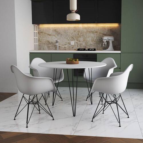 Mesa Jantar Redonda 90Cm Branca Clips 3 Pés Com 4 Poltronas Brancas Ferro Preto - Cor: Branco