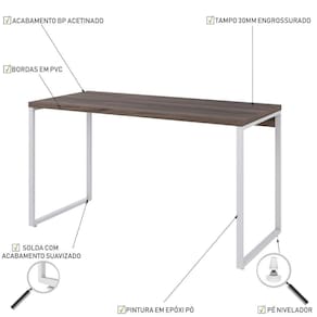 Sobre o ProdutoMesa Kuadra Office 135X60X75cm Amadeirado / Est.BrancaDescrição do Produto:A Mesa Office KUME6135 tem montagem simples e versátil, podendo ser utilizada em diversas composições com outros mó Linha Kuadra tem seu design com inspiração no estilo industrial, que remete muito a decoração usada nos Lofts das grandes metrópoles nos anos 60 e 70. Harmonizando o metal e os tons de madeira, foram projetados móveis versáteis e com estilo, que podem compor ambientes íveis cheios de personalidade, perfeitos para você decorar sua casa ou seu trabalho, tendo um resultado que caminha do estilo rústico ao Inclusos:1 MesaDimensões dos Produtos:Mesa Kuadra Office 135X60X75cm Amadeirado / 135 x 60 x 75 cmInformações Logísticas (Comp. X Prof. X Alt.) 140 x 64,5 x 7 cm - Peso: 16,484 KgPeso Total: 16,484 KgObservações:Não acompanha acessórios decorativos. Imagens meramente ilustrativas.Informações Técnicas / Características:- Cor do Produto: Amadeirado / - Marca: Compace- Modelo: KUME6135- Linha: Kuadra- Material: Mdp- Material da Estrutura / Pés: Aço- Acabamento: BP Acetinado- Escala de Brilho: Fosco- Fita de Borda: Pvc - Possui Gavetas: Não - Possui Pés: 2- Pés Niveladores: Sim - Acabamento Estrutura: Epóxi-Pó Texturizado- Formato: Retangular - Suporta Até (kg): 30 kg- Comprimento: 135cm- Profundidade: 60cm- Altura: 75cm - Peso Lí.: 15,54Kg- Recomendações de Uso, Manutenção e Limpeza: Para a limpeza, utilize flanela seca ou pano macio levemente umedecido em água. Utilize um pano seco em seguida. Evite com produtos químicos e não utilize nenhum tipo de esponja de aço.- Necessita de Montagem: Sim / Acompanha Manual de Montagem- Complexidade da Montagem: Média- Garantia: 6 meses