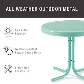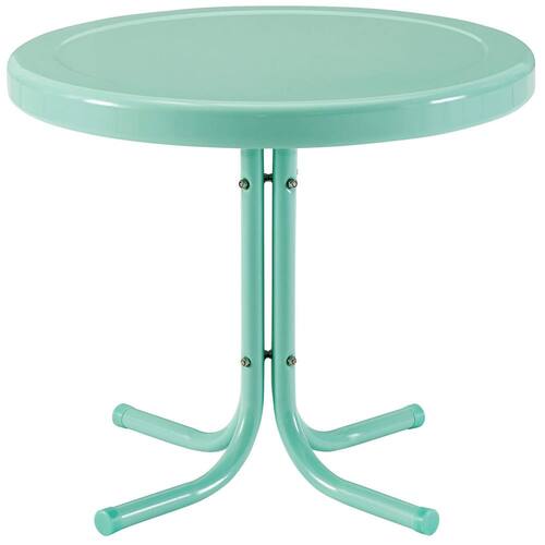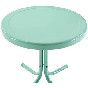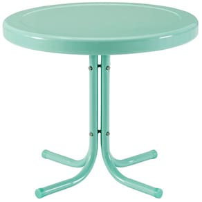 - Retrocesso retrô: esta mesa lateral de pátio externo dá vida ao charme vintage com seu acabamento vibrante com brilho aquático e base de pedestal clássica.
