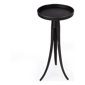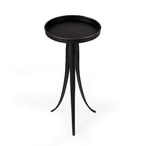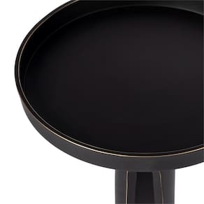 AlumínioA bela base de pedestal de três pernas desta mesa lateral confere a ela uma silhueta arejada e cheia de curvas, elegante e discreta. A mesa de alumínio tem acabamento em preto liso com um fino acabamento dourado nas bordas.