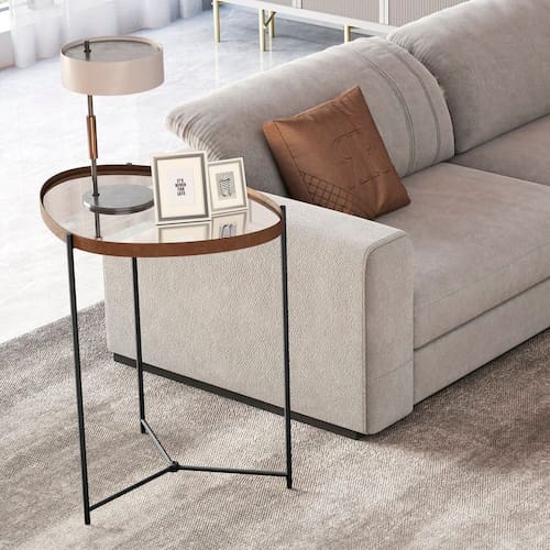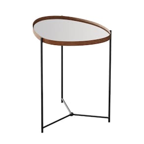 A mesa lateral orgânica Alamanda contém a borda em couro sintético e espelho 4mm, além dos pés em ferro.