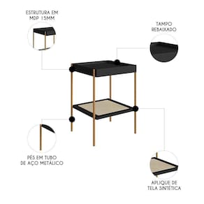 Fabricada em MDP de 15 mm com acabamento BP, a Mesa Lateral oferece durabilidade. Os pés em tubo de aço metálico com pintura epóxi garantem estabilidade, enquanto as ponteiras plásticas protegem o piso de arranhões. O aplique de tela sintética na prateleira inferior não só adiciona um elemento decorativo, mas também oferece elegância ao ambiente. Com seu design retrô, a Mesa Lateral Sofá se adequa facilmente a diferentes ambientes e estilos de decoração. Este móvel não é apenas um objeto de apoio, mas também um charme na decoração da Sala de Estar.