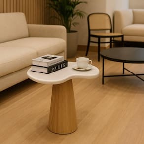 Seu formato orgânico traz fluidez e harmonia aos espaços, enquanto a combinação do Mármore Espirito Santo com a base em madeira garante um visual sofisticado e versátil, fácil de combinar com diferentes estilos de decoração.
