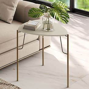 A Mesa Lateral Baixa Alef, da Lyam Decor, reinventa o conceito de móveis para sala de estar e living com seu formato triangular e cantos arredondados, unindo o estilo orgânico ao industrial.