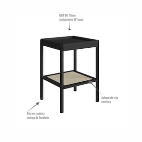 A Mesa Lateral Oslo é confeccionada em MDP com acabamento BP, pés metálicos e aplique de tela sintética na prateleira inferior, assume um papel importante na decoração, além de ser um móvel de apoio, é funcional e aberta a muitas possibilidades na hora de decorar. Traz como característica um traço artesanal, suave e acolhedor. Com design escandinavo minimalista, remete em suas linhas retas a simplicidade, charme e funcionalidade que sua casa merece. Composta com uma paleta de cores neutras, onde refletem as paisagens nas quais a linha foi inspirada, tornando-se assim a opção ideal para um ambiente com toque sofisticado e ao mesmo tempo aconchegante. Acabamento do Tampo: BP Ambiente Principal: Sala de Estar Complexidade da Montagem: Baixa: pode ser montado por uma pessoa sozinha Cor: Nero/Preto Cor do Produto: Nero/Preto Escala de Brilho: Fosco Espessura do Tampo: 15 mm Informações Complementares: Possui sapata emborrachada para evitar atrito do móvel com o piso. Prateleira com aplique de tela Sintética (PVC com poliéster) As imagens são ilustrativas e as cores podem sofrer variações de tonalidade, conforme o ajuste de configuração do monitor, os Itens Inclusos: 01 Mesa, kit ferragens, manual de montagem Linha ou Coleção: Oslo Manual de Montagem e Instalação: https://product-hub-prd.madeiramadeira.com.br/922434/documents/559a8d4b-5e1c-4913-967b-58ffc380dcd32137398307217206394272363.pdf Material da Prateleira: MDP Material do Tampo: MDP Material Principal: MDP Necessita Montagem: Sim Origem do Produto: Nacional Peso: 4,75 kg Peso Máximo por Prateleira: 5 kg Possui Espelho: Não Possui Possui Gavetas: Não Possui Portas: Não Possui Prateleiras: 01 Recomendações de Uso, Manutenção e Limpeza: Limpar utilizando apenas pano umedecido com água, nunca utilizar produtos químicos ou abrasivos, pois estes danificam o revestimento do móvel. Sistema de Montagem: Fixação é feita por parafusos, minifix e cavilha, possibilitando a desmontagem do produto sem danificá-lo Suporta Até (kg): 10 kg