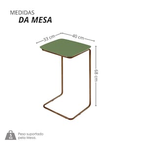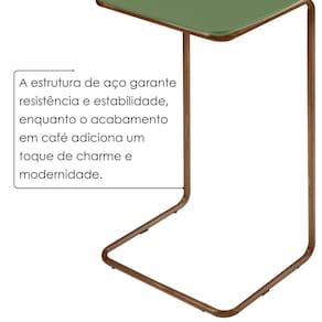 Uma mesinha elegante e funcional, ideal para a sala de estar. Com tampo em MDF que oferece resistência e um acabamento refinado, ela combina durabilidade com estilo. Sua base em aço garante estabilidade e um design contemporâneo, adicionando um toque moderno ao ambiente. Perfeita para apoiar objetos decorativos ou utilitários, unindo praticidade e sofisticação. Ambiente Principal: Sala de Estar Cor: Verde Lazza/Café Cor do Produto: Verde Lazza/Café Escala de Brilho: Fosco Itens Inclusos: 1 Mesa Manual de Montagem e Instalação: https://product-hub-prd.madeiramadeira.com.br/976088/documents/84cc8385-77a5-4727-8b9a-8b48b437fe422655889493817381771997188.pdf Marca: Larflex Material do Tampo: MDF Material Principal: MDF Necessita Montagem: Não Origem do Produto: Nacional Peso: 2,9 kg Possui Espelho: Não Possui Possui Gavetas: Não Possui Portas: Não Possui Prateleiras: Não Recomendações de Uso, Manutenção e Limpeza: Um pano seco e um pano levemente umedecido, evitar alvejantes e produtos de limpeza. Suporta Até (kg): 5 kg