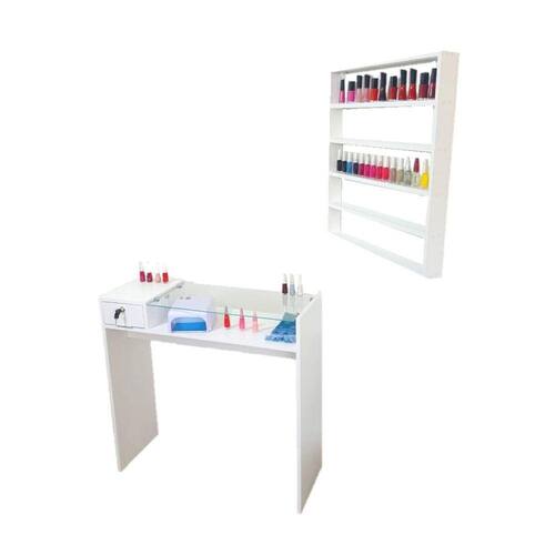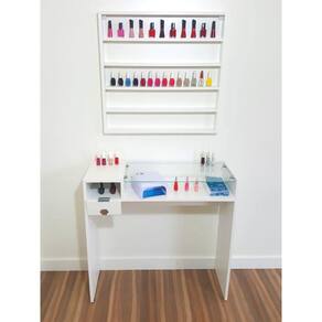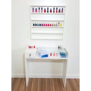 MATERIAL:MDF 15mm: o máximo em qualidade, durabilidade e resistência a riscosVidro Temperado: 5x mais resistente que o vidro comum.Suporte metálico Cromado para fixação do vidroAlça Cromada: Instalação opcional.Fechadura com 2 chaves.DIMENSÕES MESA:Comprimento: 84cm, Altura: 81cm, Profundidade: 30cmDistância entre o vidro e o tampo MDF: 10cmDIMENSÕES ESMALTEIRO:Comprimento: 68cm, Altura: 65cm, Profundidade: 6cm.Acompanha manual de instruções para instalação. Marca: Sr Fabrica De Moveis