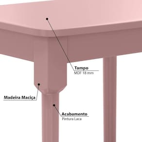 A Mesa infantil Mariah, além de seu belo design vai proporcionar ao seu filho momentos de diversão e aprendizado. O produto tem um belo acabamento laqueado, com tampo feito em MDF, assegura maior resistência e estabilidade para as brincadeiras das crianças. Acabamento: Laca Altura dos Pés: 48 cm Altura Máxima dos Pés: 48.0000 Ambiente Principal: Quarto Infantil Atóxico: Sim codigo_ean: 7908208502155 Complexidade da Montagem: Baixa: pode ser montado por uma pessoa sozinha Cor: Rosa Bebê Cor do Produto: Rosa Bebê Escala de Brilho: Fosco Itens Inclusos: 1 Mesa, Kit Ferragens e Manual de Montagem Linha ou Coleção: Mariah Lugares: 04 Lugares Manual de Montagem e Instalação: https://cdn2.madeiramadeira.com.br/prd/moveis-deiss/1263690-Mesa%20Infantil%202022.pdf Material Principal: Madeira Maciça Necessita Montagem: Sim Origem do Produto: Nacional Peso: 10 kg Recomendações de Uso, Manutenção e Limpeza: Na limpeza não utilizar produtos químicos e abrasivos, usar apenas um pano umedecido, para garantir a maior durabilidade do móvel. Suporta Até (kg): 50 kg Tipo de Madeira Maciça: Eucalipto