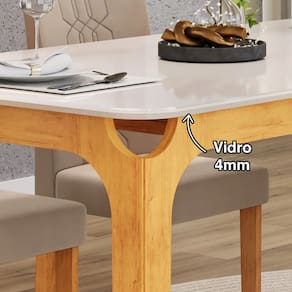 Marca: DJ Móveis Modelo: Mesa Marina Material da Estrutura (Cadeira e Mesa): MDF e MDP Quantidade de Cadeiras: 6 Peso Máximo Suportado Mesa: 15Kg Peso Máximo Suportado Cadeira: 130Kg Formato da Mesa: Retangular Tampo: Chanfrado Curvo Tampo Fixo: Pés Material do Tampo: MDF e Vidro Comum Pintado 4mm Acabamento das Bordas(Cadeira): PVC / Papel Revestimento externo: Impressão Ultravioleta com 08 camadas Alto brilho e Texturizado Fosco Possui Vidro: Sim Produto Extensível: Não Possui sapatas para proteger contra umidade do piso: Sim, sapatas deslizadoras Marca: Não Informado