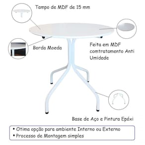 Características: Tampo de madeira em MDF 15mm Base em aço com pintura epóxi Compacta Leve Resistente e durável Pode ficar exposta ao sol Feita em madeira com tratamento anti umidade Fica bem em ambientes internos e externos Praticidade na limpeza e manutenção Processo de montagem simples