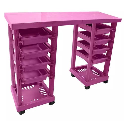 Mesa Multiuso Média Pink Elegance Dupla 3044 Santa Clara Mesa Média Elegance Dupla com 6 Gavetas A Santa Clara lançou uma nova linha de produtos para uso em salões de beleza, é a linha ELEGANCE DUPLA, é uma mesa/balcão com 3 gavetas de cada lado na parte de baixo. O melhor e que este produto vem com rodinhas facilitando o deslocamento da mesa de um lugar para outro, é uma ótima pedida para quem gosta de ter tudo bem arrumado no salão.