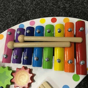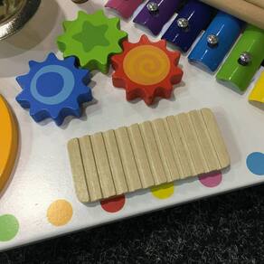 Essa bancada musical reúne vários instrumentos musicais infantis que agradam a família inteira É uma mesa musical completa, com xilofone, prato, tambor e reco-reco. Além disso, possui rodinhas de engrenagens para a criança rodas, estimulando também a coordenação motora.
