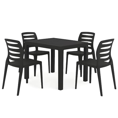 Cadeira Ville e mesa Niala um modelo versátil e empilhável, confeccionada em polipropileno e pensada para ambientes leves e despojados.