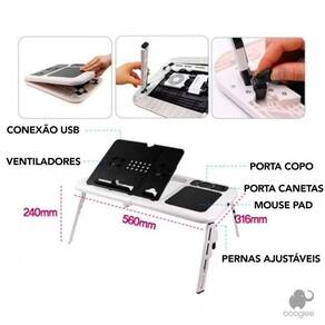 Características: - 2 Coolers - Regulagens de Altura e Inclinacao - Mouse pad - Porta Copos e Porta Caneta - Compativel com Notebook de Ate 15,4