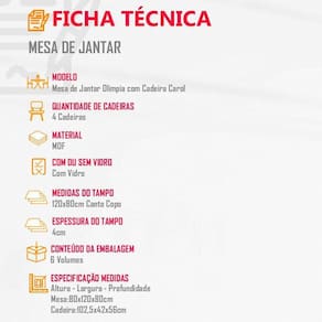 Com espaco ideal para dispor as melhores receitas e recepcionar a sua familia, a sala de jantar Olimpia com cadeiras Carol e um movel completo em todos os sentidos. O conjunto e compacto, possui sua estrutura em MDF e acabamento em pintura UV, que proporcionam melhor durabilidade ao produto. As cadeiras tem um designer sofisticado, misturando o moderno e o classico com seu encosto em detalhes de botoes, trazendo conforto e elegancia para seu lar. Possui puxador na parte superior do encosto para facilitar a movimentacao e evitar o toque ao tecido. Caracteristicas: Contem vidro Tampo canto curvo Estrutura em MDF Acabamento em Pintura UV Dimensoes Mesa: Altura: 80 cm Largura: 120 cm Profundidade: 80 cm Dimensoes Cadeira: Altura: 102,5 cm Largura: 42 cm Profundidade: 56 cm Garantia do Fornecedor 3 meses Informacoes importantes : As tonalidades das cores podem sofrer alteracao de acordo com a configuracao de cada monitor. Os objetos que ambientam as fotos nao acompanham o produto. Nao disponibilizamos a montagem do produto. O produto acompanha manual de montagem. Nao nos responsabilizamos por danos no produto causados por montagem de qualquer outra forma que nao seja a descrita no manual. Verifique as dimensoes do produto e certifique-se que o percurso que ele fara ate o local de uso permite sua passagem. Moderna Mobilia reserva o direito de alterar as especificacoes tecnicas sem previo aviso. As medidas contidas no site podem sofrer variacoes de acordo com a montagem, tipo de costura etc.