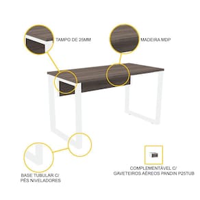 Precisa de ajuda para escolher uma mesa nova para seu escritório? Na dúvida, escolha um clássico atemporal. Essa mesa com pés tubulares brancos e tampo de madeira MDP em tom de madeira escura é a opção mais básica, elegante e simples que você pode encontrar. Ela combina com tudo - certeza que vai combinar com seu ambiente de trabalho. Sem erro - e com muita qualidade - ela pode ser a peça que falta em sua grande empresa ou um item essencial para quem está montando o primeiro escritório. Procura algo menos simples? Fácil: essa mesa de trabalho é compatível com gaveteiros da linha P25 da Pandin, deixando sua escolha ainda mais completa. Peça coringa em uma decoração multicolorida ou a estrela da cena em um ambiente monocromático clean e discreto, essa mesa faz parte da Linha P25 da Pandin, uma linha com design clássico e cheia de estilo, com diferentes combinações de cores, perfeita para diversos profissionais e ambientações.