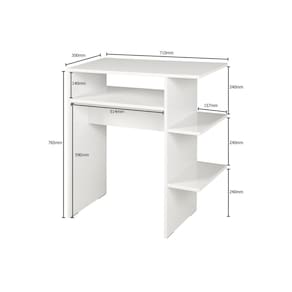 Descritivo: Comprimento - 710 mm Altura - 765 mm Largura - 300 mm Suporte apoio lateral - 300 x 157 mm Suporte central - 514 x 300 mm Tampo em mdf com espessura de 15mm Disponível na cor branca