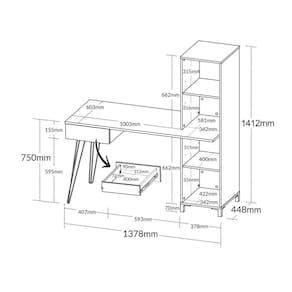 Ela é indicada para Escritórios, Salas de Estar ou Quartos. Ela possui tampo de 18mm com borda ABS de 2mm. Possui também uma gaveta com corrediça telescópica, duas prateleiras com regulagem de altura.