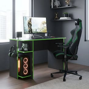 A Mesa para Computador Gamer é ideal para quem busca um móvel moderno, funcional e com visual marcante para compor o setup. Com acabamento em preto e verde, ela traz um estilo atual para quartos, home office e espaços gamer, além de ajudar na organização dos acessórios e equipamentos do dia a dia.