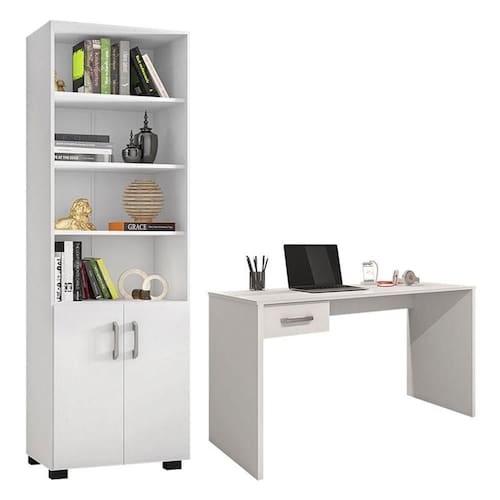 Mesa para Computador Gávea com Gaveta e Livreiro Office com Portas Pequenas Branco Trama - Móveis Leão