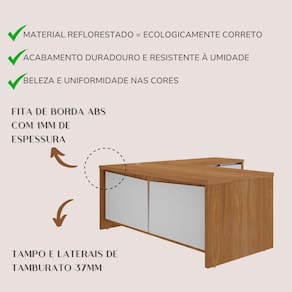Características da Mesa para Escritório 2 Portas 3 Gavetas Diretor em L: - Tampos e laterais Tamburato 37mm com fita de borda ABS com 1mm de espessura; - Balcão com 2 portas e prateleira interna em MDP 15mm com fita de borda ABS com 0,45mm; - 3 gavetas com corrediças telescópicas, fundo em MDF 6mm e frente em MDP 15mm com fita de borda ABS com 0,45mm de espessura; - Acompanha passa fio para tampo; - Espaço ideal para CPU na base do balcão; - Traseira estrutural com acabamento dos dois lados em MDP 15mm com fita de borda ABS com 0,45mm de espessura; - Base em MDP 15mm com fita de borda ABS com 0,45mm de espessura; - 6 Sapatas plásticas com regulagem de altura; - Não acompanha objetos decorativos; - Montagem por conta do comprador;