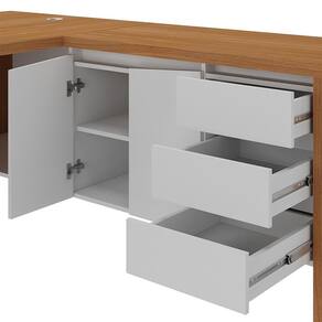 Com design em formato de L, essa mesa de escritório se encaixa perfeitamente em qualquer ambiente, oferecendo praticidade e estilo, além da alta qualidade e resistência, já que possui tampo Tamburato de 37mm, ou seja, uma mesa durável e resistente ao uso do dia a dia. Mais que isso, ainda é uma mesa multifuncional, pois conta com 3 gavetas espaçosas que proporcionam um armazenamento eficiente para seus itens essenciais de escritório, além do compartimento interno das 2 portas, ideal para guardar documentos e materiais que precisam ficar organizados e ao alcance das mãos. Para completar a funcionalidade, o passa-fios no tampo e o nicho no balcão próprio para o CPU manterão a sua estação de trabalho completa e organizada.