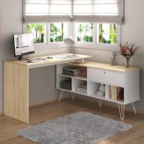 Com montagem ível (lado esquerdo ou direito), essa escrivaninha em L se adapta ao seu espaço e hábitos, enquanto os encantadores pés de metal trazem um toque industrial cheio de personalidade. Além disso, os nichos organizadores oferecem espaço estratégico para livros, decorações e itens essenciais, mantendo tudo à mão sem perder o estilo. E o melhor? Com traseira totalmente acabada, você posiciona a mesa onde quiser - como divisória de ambientes, encostada na parede ou até no centro do espaço, criando um cantinho produtivo que reflete sua essência. Porque trabalhar bem começa em um ambiente que é puramente seu.