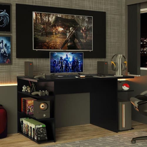 Com diversas prateleiras e tampo grande, a mesa possui espaço para tudo: console, CPU, monitor, teclado, mouse, controle e . É perfeita para passar horas jogando, seja no ou no videogame.