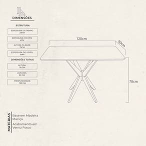 Detalhe Funcional: Sapatas reguladoras de altura para diferentes tipos de piso Acabamento: Verniz Acabamento da Base: Verniz Acabamento do Tampo: Laca Ambiente Principal: Sala de Jantar Atóxico: Sim codigo_ean: 7900288196132 Complexidade da Montagem: Baixa: pode ser montado por uma pessoa sozinha Cor: Mel Cor do Produto: Mel Design da Base: Em X Dobrável: Não Escala de Brilho: Fosco Espessura do Tampo: 1,8 mm Extensível: Não Itens Inclusos: 1 Mesa e Kit Ferragem Linha ou Coleção: Vegas Manual de Montagem e Instalação: https://product-hub-prd.madeiramadeira.com.br/458151252/documents/8cc8ea3f-d42c-43bb-9ae9-2509a663c5e93071385491417526017198762.pdf Marca: Árvore de Minas Material da Base: Madeira Maciça Material do Tampo: MDF Material Principal: Madeira Maciça Medida da Base (A x L x P): 75 x 90 x 120 Medida da Mesa (A x L x P): 78 X 90 X 120 Medida do Tampo (L x C x E): 90 x 120 x 1,8 Necessita Montagem: Sim Origem do Produto: Nacional Peso: 34,2 kg Possui Portas: Não Possui prateleira: Não Possui Rodízio: Não Possui Suporte Giratório: Não Possui Vidro: Sim Recomendações de Uso, Manutenção e Limpeza: Utilizar pano umido, não utilizar liquidos abrasivos Sistema de Montagem: Fixação de Parafusos Suporta Até (kg): 120 kg Tipo de Madeira Maciça: Tauari Tipo de Madeira Maciça da Base: Tauari