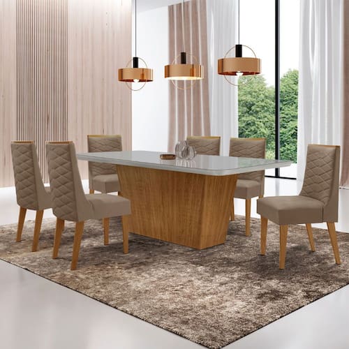 Mesa para Sala de Jantar Aida 180cm MDF Canto Copo com Vidro e 6 Cadeiras Safira
