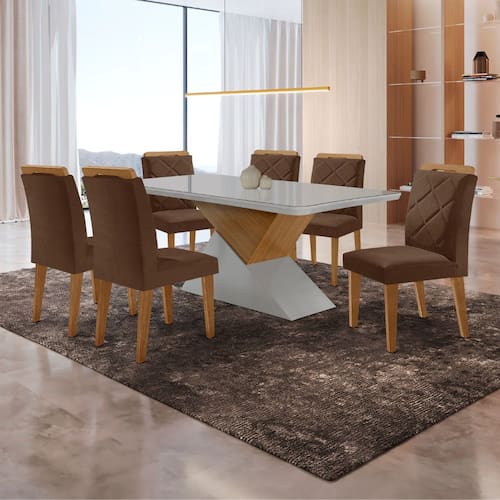 Mesa para Sala de Jantar Aster 180cm MDF Canto Copo com Vidro e 6 Cadeiras Melissa