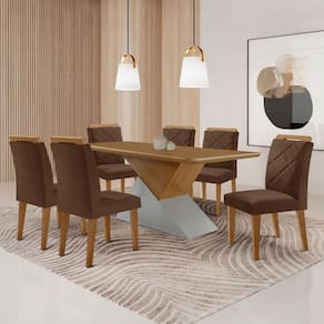 A Sala de Jantar Aster com Cadeiras Melissa é um conjunto que exala elegância e sofisticação. Produzidas em MDF de qualidade, as cadeiras, totalmente estofadas, garantem conforto absoluto, enquanto os bordados no encosto adicionam um toque de charme exclusivo. A mesa, com sua base de linhas fluidas e formato moderno, completa o visual, tornando este ambiente ideal para desfrutar de momentos inesquecíveis. Com esse conjunto, você terá a combinação perfeita de qualidade e conforto que merece!
