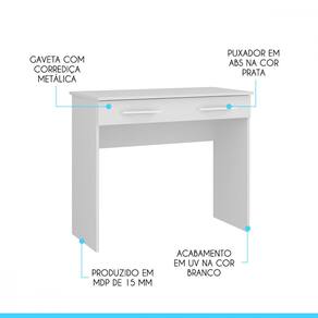 Características da Bancada: Produzida em MDP de 15 mm com acabamento UV na cor Branco. Possui uma gaveta com corrediça metálica e puxador tipo alça em ABS na cor prata.
