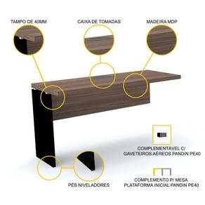 Elaborar a planta de um escritório unindo funcionalidade, beleza e bom gosto pode ser difícil. Porém, com móveis práticos e de boa qualidade, o desafio se transforma em uma tarefa fácil. Ao desenhar o projeto das mesas de seu ambiente corporativo, considere esta mesa modulável complementar da linha PE40 da Pandin, uma peça chave para expandir sua plataforma de trabalho, servindo como módulo para ser integrado a uma mesa plataforma inicial ou a outra mesa complementar. Com tampo na cor madeira escura e pé tipo painel na cor preta, ela ainda conta com caixa Power Box para facilitar a instalação de aparelhos eletrônicos ou telefônicos, tornando cada estação de trabalho independente e conectada, considerando diversos tipos de função na sua empresa. Esta mesa é uma peça com a qualidade da linha PE40 da marca Pandin, conhecida por seus móveis de escritório de design clássico e sofisticado que unem beleza, funcionalidade e estilo ao melhor custo-benefício do mercado.