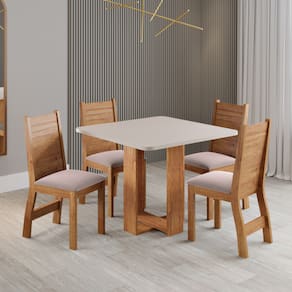 O Conjunto Sala de Jantar Mesa Oasis com 4 Cadeiras Agatha Viero é perfeito para quem busca elegância e funcionalidade em espaços compactos. A mesa possui tampo em MDF de 25mm, garantindo resistência e durabilidade. As 4 cadeiras Sol combinam MDP e MDF, com assentos acolchoados em espuma D16 para maior conforto. O revestimento em tecido Veludo adiciona sofisticação ao ambiente. Com acabamento em pintura UV semi-brilho, a mesa suporta até 50kg e cada cadeira até 80kg. Uma escolha ideal para um espaço acolhedor e moderno.Características:4 CadeirasAcabamento em pintura UV, semi-brilhoAssento espuma D26Cadeira suporta até 80kgEstrutura em MDP/MDFMesa quadradaMesa suporta até 50kgRevestimento em tecido VeludoTampo pintado em MDF 25mmDimensões Cadeira:Altura: 89 cmLargura: 39 cmProfundidade: 51 cmDimensões Mesa:Altura: 78,9 cmLargura: 90 cmProfundidade: 90 cmPeso Total: 49,40 kgGarantia do fornecedor de 3 meses. Marca: Não Informado