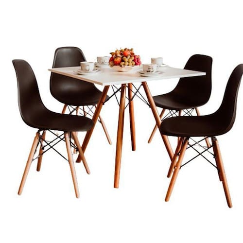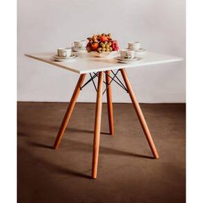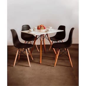 Mesa Quadrada Branca 80cm + 04 Cadeiras Eiffel Preta Com uma clássica combinação de cores, o modelo Eiffel é para você De tampo quadrado, estrutura em ferro maciço e pés em madeira pinus, ela acomoda os seus convidados enquanto deixa o momento mais intimista por conta do formato. Mas não é só a sua rotina que ganha uma bela aliada: ela também complementa a decoração com sofisticação, além de ser harmonizável com cadeiras da mesma cor ou coloridas, seja para garantir um visual monocromático ou voltado para algo arrojado.