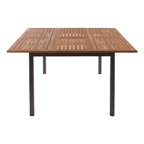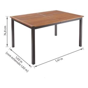 Resumo das caracteristicas e especificacoes: Mesa Quadrada Extensivel para Jardim e Varanda; Tonalidade Marrom; Formato Quadrado; Altura 74,80 cm; Largura 102,00 cm; Comprimento 147,00 cm; Tampo de Madeira Eucalipto; Estrutura de Metal Aluminio; Dobravel; Nao possui furo para ombrelone; Estilo Contemporaneo; Nao Giratoria; Extensivel ate 162,30 cm; Nao Empilhavel; Indicada para areas externas com cobertura; Vem Desmontada; Garantia do Fabricante de 36 meses; Inclui apenas a mesa.