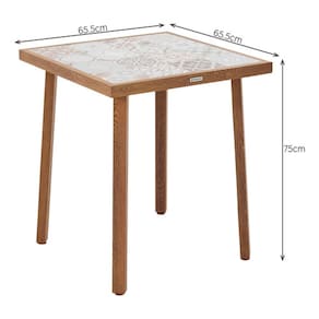 Esta mesa de jardim e construida com um tampo de ceramica de alta qualidade e uma estrutura de metal resistente feita de aluminio, garantindo durabilidade e resistencia as intemperies. Com dimensoes de 75cm de altura e 65,5cm de largura e comprimento, oferece um espaco amplo para acomodar pratos, bebidas e outros itens essenciais para o lazer ao ar livre. Apesar de nao ser dobravel, sua montagem e simples e direta, permitindo que voce a instale facilmente em seu espaco preferido.