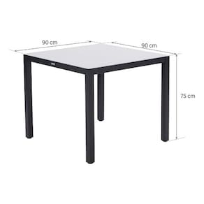 Resumo das caracteristicas e especificacoes: - Mesa quadrada para jardim e varanda com dimensoes de 75x90x90cm - Construida em aluminio resistente para durabilidade e resistencia ao clima - Superficie de vidro preto para um visual elegante e facil limpeza - Design quadrado para acomodar uma variedade de itens - Ideal para refeicoes ao ar livre, encontros sociais ou relaxamento - Design compacto adequado para espacos pequenos - Cor preta para combinar com qualquer decoracao. Marca: Não Informado Ean: 3276007268058