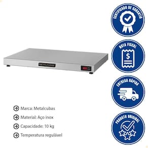 Ela possui controle digital de temperatura, mantendo a superfície aquecida de forma estável a até 80C, ideal para manter os alimentos prontos para o serviço.