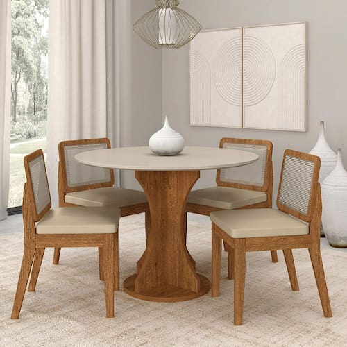 Detalhes Técnicos das Cadeiras -Assento Tapeçados, Estofados e Fixos -Encosto Tela Sintética -Peso Suportado da Cadeira:90KG -Facilidade da Montagem:Média -Tonalidade da Cadeira:Freijó/Corino Bege -Espuma do Assento:D16 -Tipo de Pintura:UV Texturizada -Material da Estrutura:MDF 25/18mm -Medida da Cadeira:A:84CMxL:45CMxP:53CM