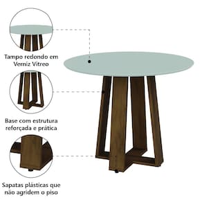 MATERIAL: MDF madeiras provenientes de reflorestamento REVESTIMENTO: Pintura UV (Ultravioleta) BASE: MDF com 25mm de espessura TAMPO: MDF com 18mm de espessura POSSUI VIDRO: Não TAMPO GIRATÓRIO: Não ACABAMENTO DO TAMPO: MDF com pintura verniz vitreo PÉS: MDF - 12mm e 15mm PARA QUANTOS LUGARES: 4 PESO: 19,85kg SUPORTA ATÉ: 25kg SISTEMA DE MONTAGEM: Parafusos GRAU DE DIFICULDADE DE MONTAGEM: Fácil ITENS INCLUSOS: Acessórios e manual para montagem