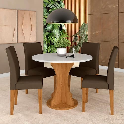 Detalhes Técnicos da Mesa: -Acabamento da Mesa: Pintura Texturizada - Tipo de Pintura: UV Texturizada - P.U - Borda da Mesa: P.U - Quantidade de Lugares: 04 - Material da Base da Mesa: MDF 25mm - Material do Tampo: MDF - Espessura do Tampo: 25 mm - Possui Tampo de Vidro: Não - Tonalidade do Tampo: Off White -Tonalidade da base da mesa: Cinamomo - Medida da Mesa Montada: A:80CM x L:90CM x P:90CM - Possui Suporte Giratório: Não - Formato: Redondo