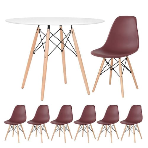 Mesa Redonda Eames 100cm Branco + 6 Cadeiras Marrom