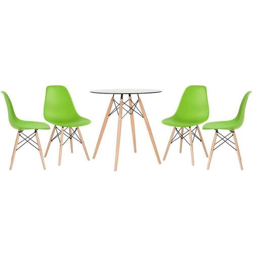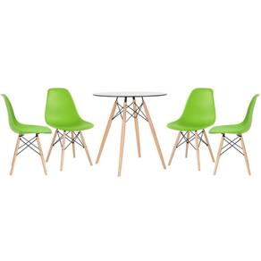 Cadeira Eames DSW: Material do assento: Polipropileno - Material da base: Madeira e aço - Altura do assento: 43 cm - Largura do assento: 46 cm - Profundidade do assento: 40 cm - Distância entre os pés: 40 cm - Peso suportado: 130 kg. Mesa Eames: Material do tampo: Vidro temperado 8 mm - Material da base: Madeira e aço - Altura: 75 cm - Diâmetro do tampo: 70 cm - Garantia: 3 meses.